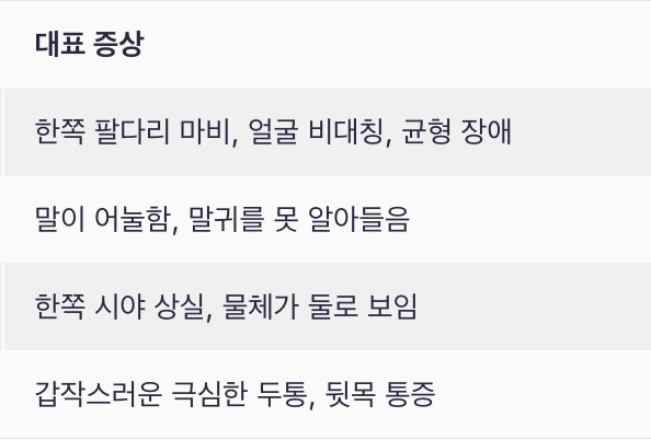 | 신체 증상 | 한쪽 팔다리 마비, 얼굴 비대칭, 균형 장애 |