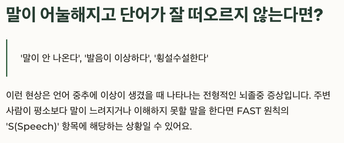 '말이 안 나온다', '발음이 이상하다', '횡설수설한다' 이런 현상은 언어 중추에 이상이 생겼을 때 나타나는 전형적인 뇌졸중 증상입니다. 주변 사람이 평소보다 말이 느려지거나 이해하지 못할 말을 한다면 FAST 원칙의 ‘S(Speech)’ 항목에 해당하는 상황일 수 있어요.