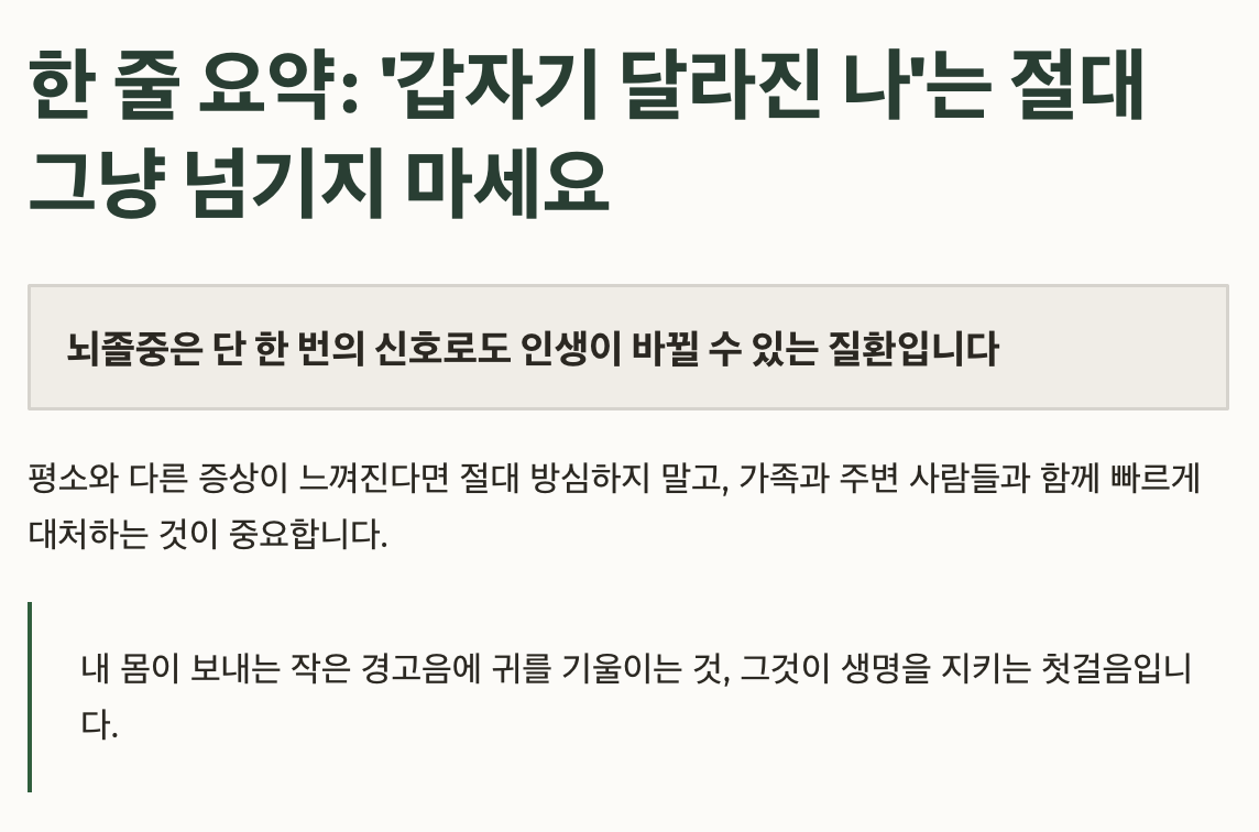 뇌졸중은 단 한 번의 신호로도 인생이 바뀔 수 있는 질환입니다. 평소와 다른 증상이 느껴진다면 절대 방심하지 말고, 가족과 주변 사람들과 함께 빠르게 대처하는 것이 중요합니다. 내 몸이 보내는 작은 경고음에 귀를 기울이는 것, 그것이 생명을 지키는 첫걸음입니다.