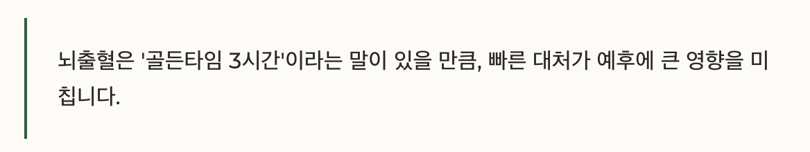 뇌출혈은 '골든타임 3시간'이라는 말이 있을 만큼, 빠른 대처가 예후에 큰 영향을 미칩니다.