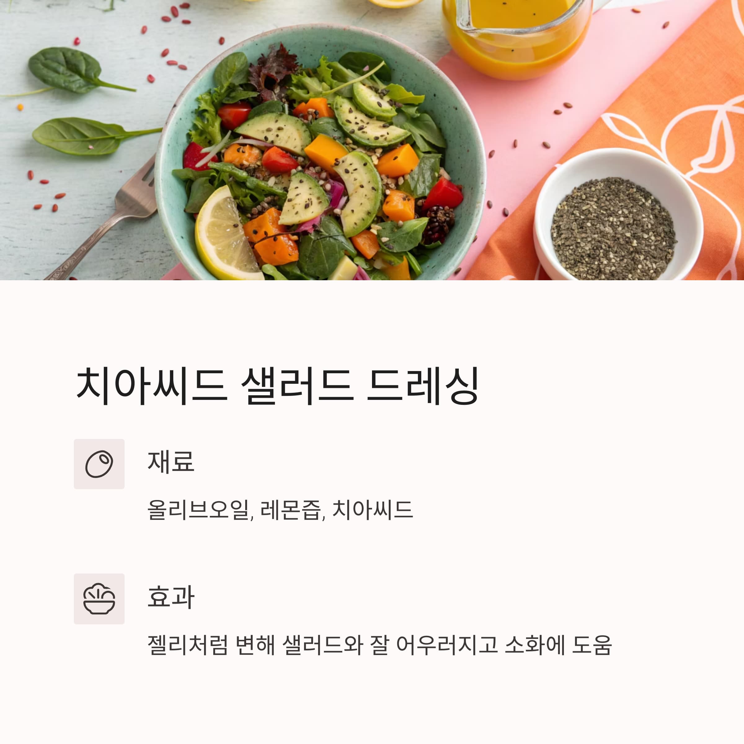 올리브오일, 레몬즙, 치아씨드를 활용해 보세요.