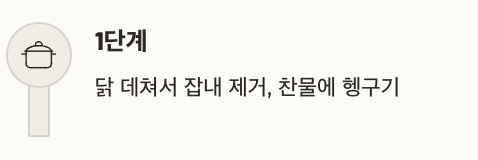 | 1단계 | 닭 데쳐서 잡내 제거, 찬물에 헹구기 |