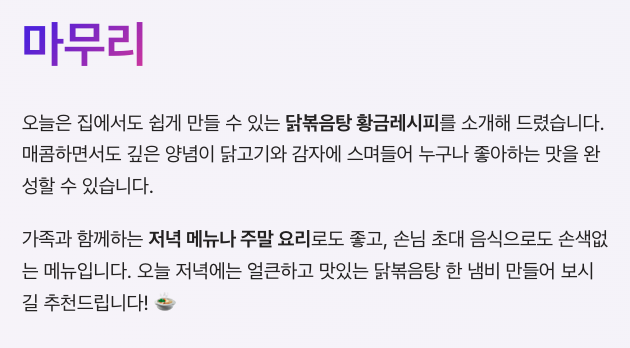 특히 가족이 함께 먹는 저녁 메뉴나 주말 요리로도 좋고, 손님 초대 음식으로도 손색없는 메뉴입니다. 오늘 저녁에는 얼큰하고 맛있는 닭볶음탕 한 냄비 만들어 보시길 추천드립니다.