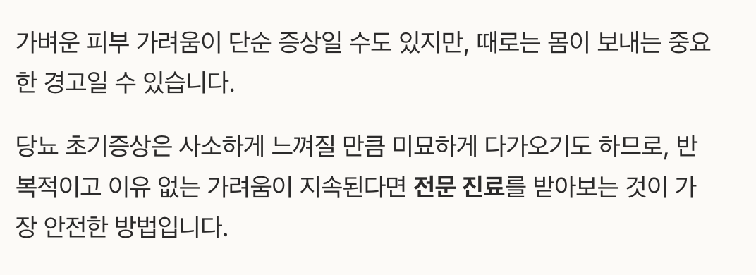 가벼운 피부 가려움이 단순 증상일 수도 있지만, 때로는 몸이 보내는 중요한 경고일 수 있습니다. 당뇨 초기증상은 사소하게 느껴질 만큼 미묘하게 다가오기도 하므로, 반복적이고 이유 없는 가려움이 지속된다면 전문 진료를 받아보는 것이 가장 안전한 방법입니다.