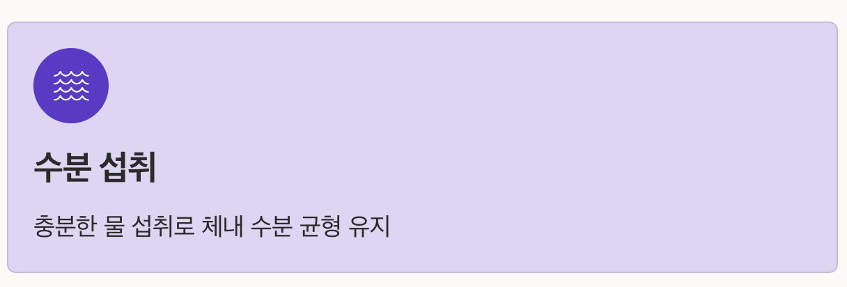 | 수분 섭취 | 충분한 물 섭취로 체내 수분 균형 유지 |