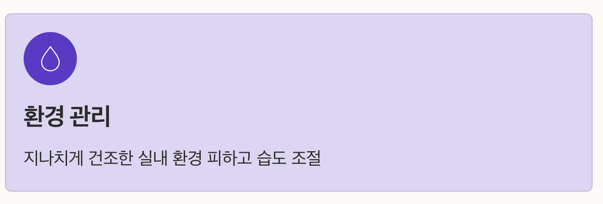 | 환경 관리 | 지나치게 건조한 실내 환경 피하고 습도 조절 |