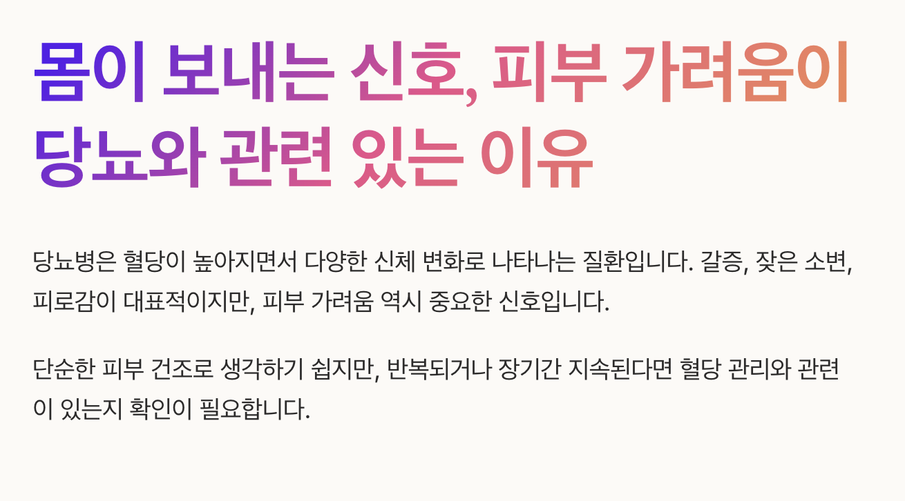 혈당이 높아지면 혈액 순환이 원활하지 않아 피부에 필요한 산소와 영양 공급이 줄어듭니다. 이로 인해 피부가 쉽게 건조해지고, 작은 자극에도 가려움이 생기기 쉽습니다. 특히 당뇨 초기에는 뚜렷한 자각 증상이 없는 경우가 많아 가려움 같은 피부 증상이 간접적인 신호가 될 수 있습니다.