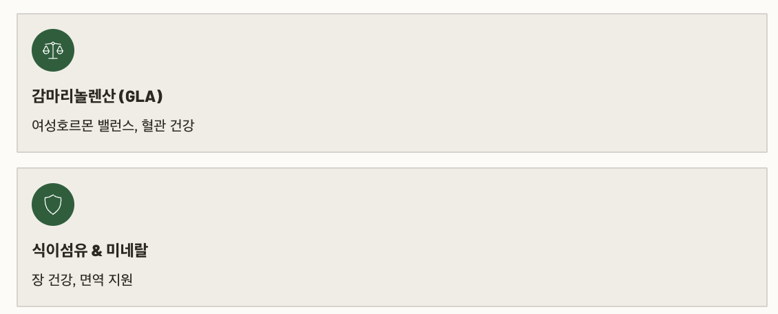 | 감마리놀렌산 (GLA) | 여성호르몬 밸런스, 혈관 건강 |