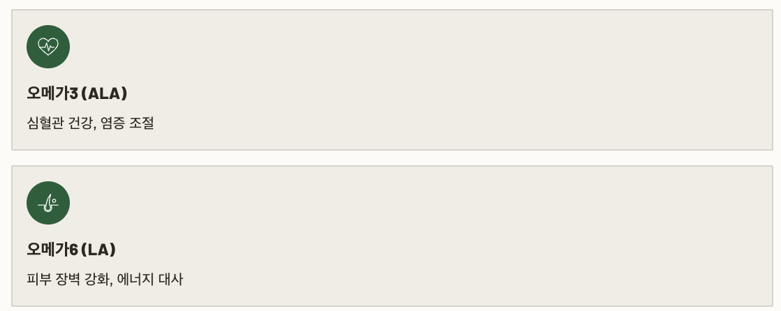 | 오메가3 (ALA) | 심혈관 건강, 염증 조절 |