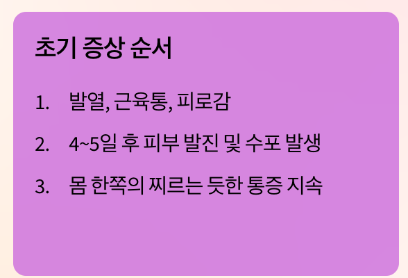 초기 단계 몸살, 근육통, 피부 통증 항바이러스제 즉시 시작 72시간 내 치료