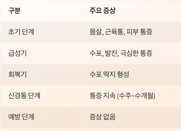 대상포진은 단계별로 증상과 치료방법이 다르게 적용됩니다. 아래 표를 통해 전체 흐름을 한눈에 확인할 수 있습니다.
