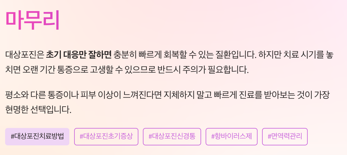평소와 다른 통증이나 피부 이상이 느껴진다면 지체하지 말고 빠르게 진료를 받아보는 것이 가장 현명한 선택입니다.