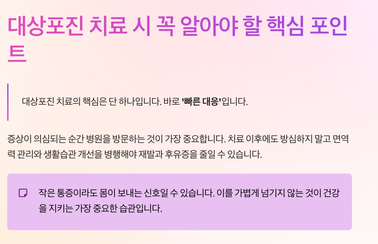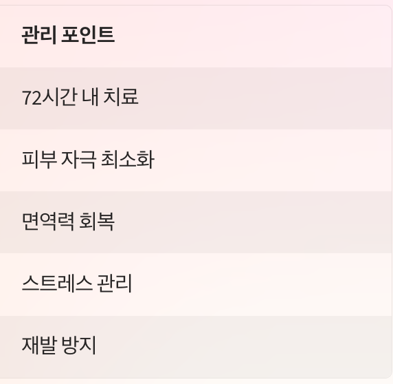 대상포진 치료의 핵심은 단 하나입니다. 바로 ‘빠른 대응’입니다. 증상이 의심되는 순간 병원을 방문하는 것이 가장 중요합니다.