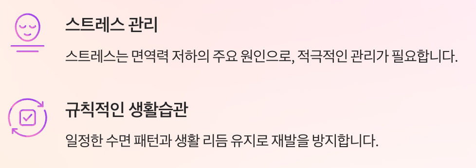 특히 면역력이 떨어지면 회복이 늦어지고 재발 가능성도 높아지기 때문에 꾸준한 관리가 필요합니다.
