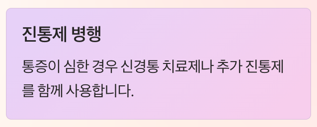 통증이 심한 경우에는 신경통 치료제나 추가 진통제를 병행하기도 합니다. 일부 환자는 치료 이후에도 통증이 지속되는 신경통을 경험할 수 있기 때문에 초기 치료가 매우 중요합니다.