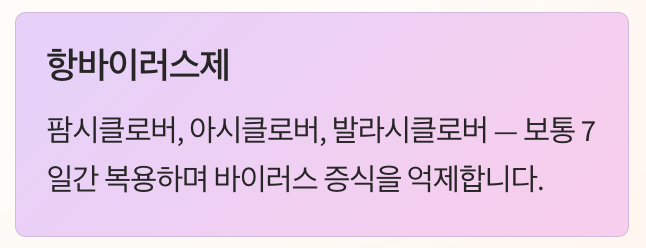 대표적인 항바이러스제로는 팜시클로버, 아시클로버, 발라시클로버 등이 있으며, 보통 7일간 복용하게 됩니다. 이 약물은 바이러스 증식을 억제하여 증상을 빠르게 완화시키는 역할을 합니다.