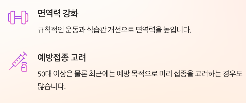 특히 50대 이상에서는 예방접종이 효과적인 방법으로 알려져 있으며, 최근에는 예방 목적 접종을 미리 고려하는 경우도 많습니다.