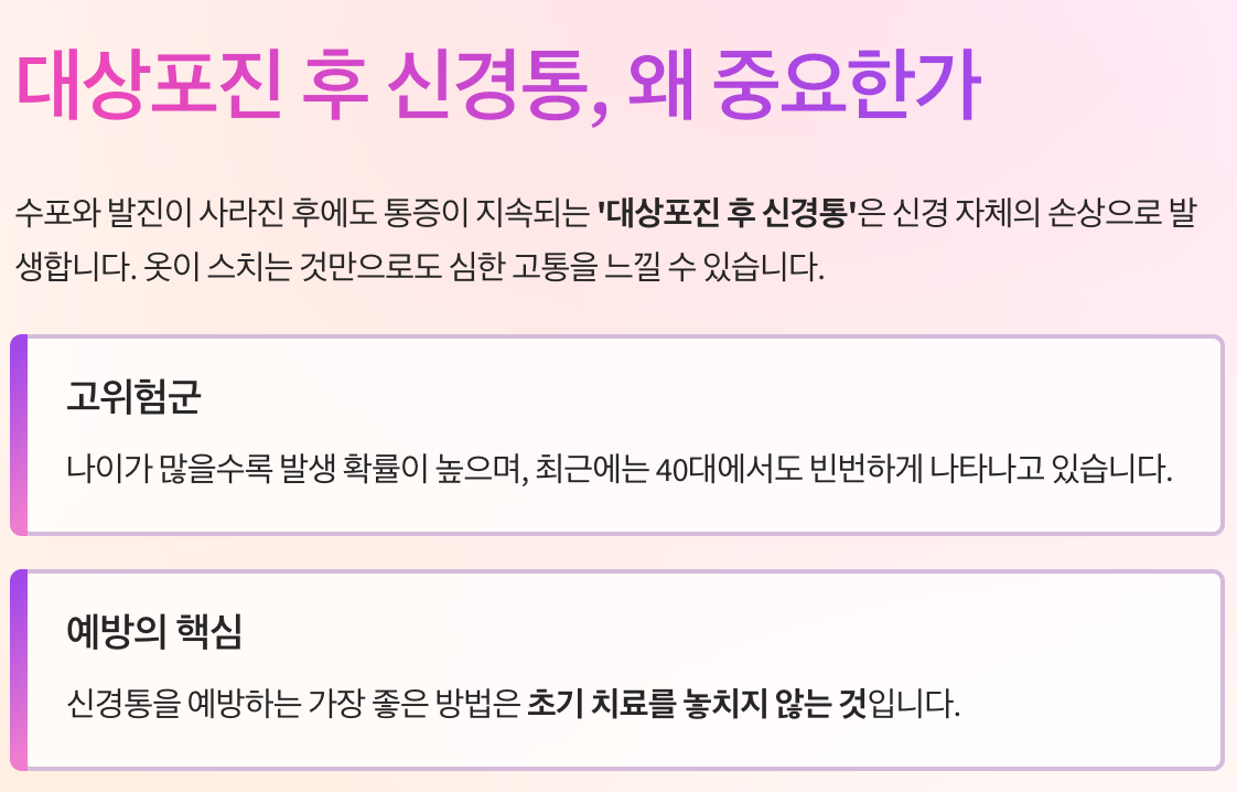 대상포진에서 가장 힘든 부분은 오히려 치료 이후일 수 있습니다. 수포와 발진이 사라진 후에도 통증이 지속되는 ‘대상포진 후 신경통’이 발생할 수 있기 때문입니다.