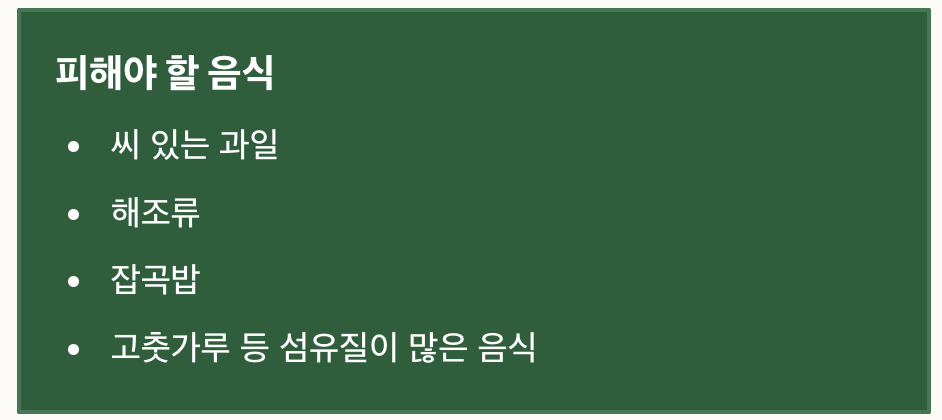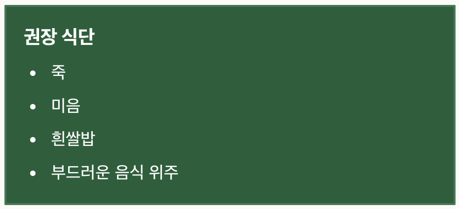 죽, 미음, 흰쌀밥 위주로 식단을 간단히 조절하는 것이 좋습니다.
