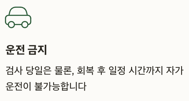 차량 운전은 검사 당일은 물론, 회복 후 일정 시간까지 피해야 하니