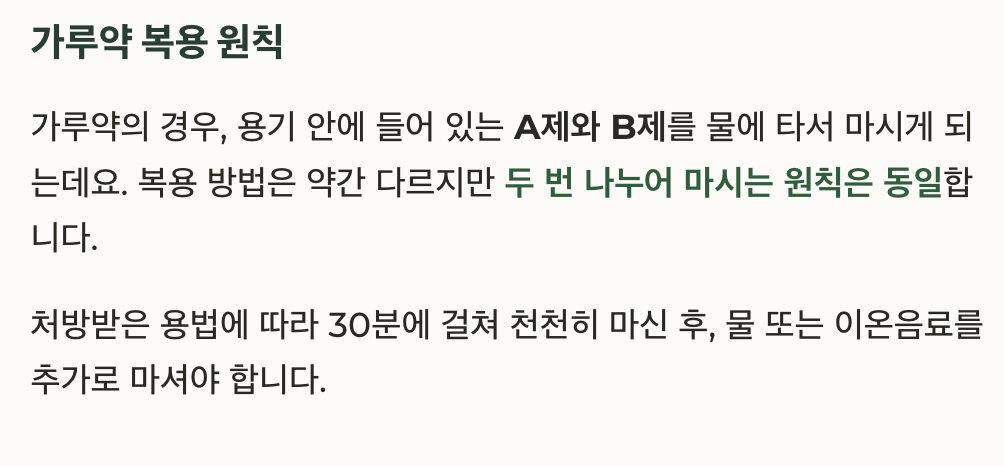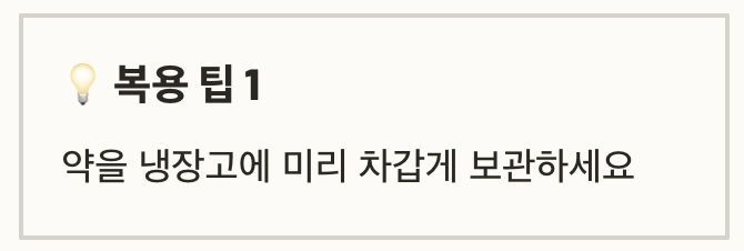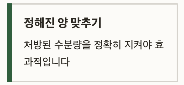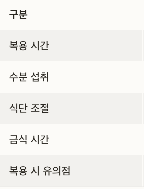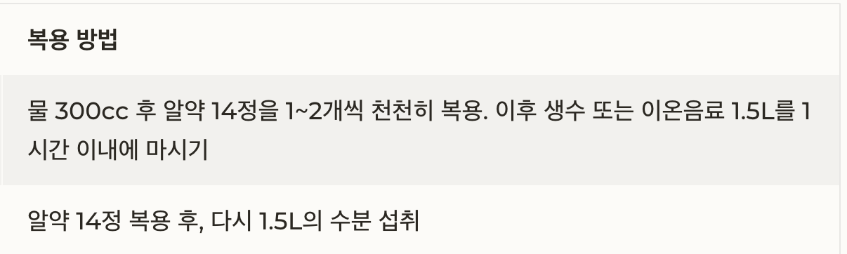 | 수분 섭취 | 매 복용 후 생수 또는 이온음료 1.5L 이상 천천히 마시기 |