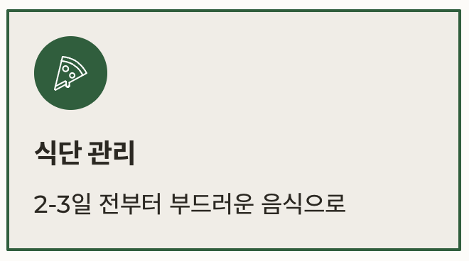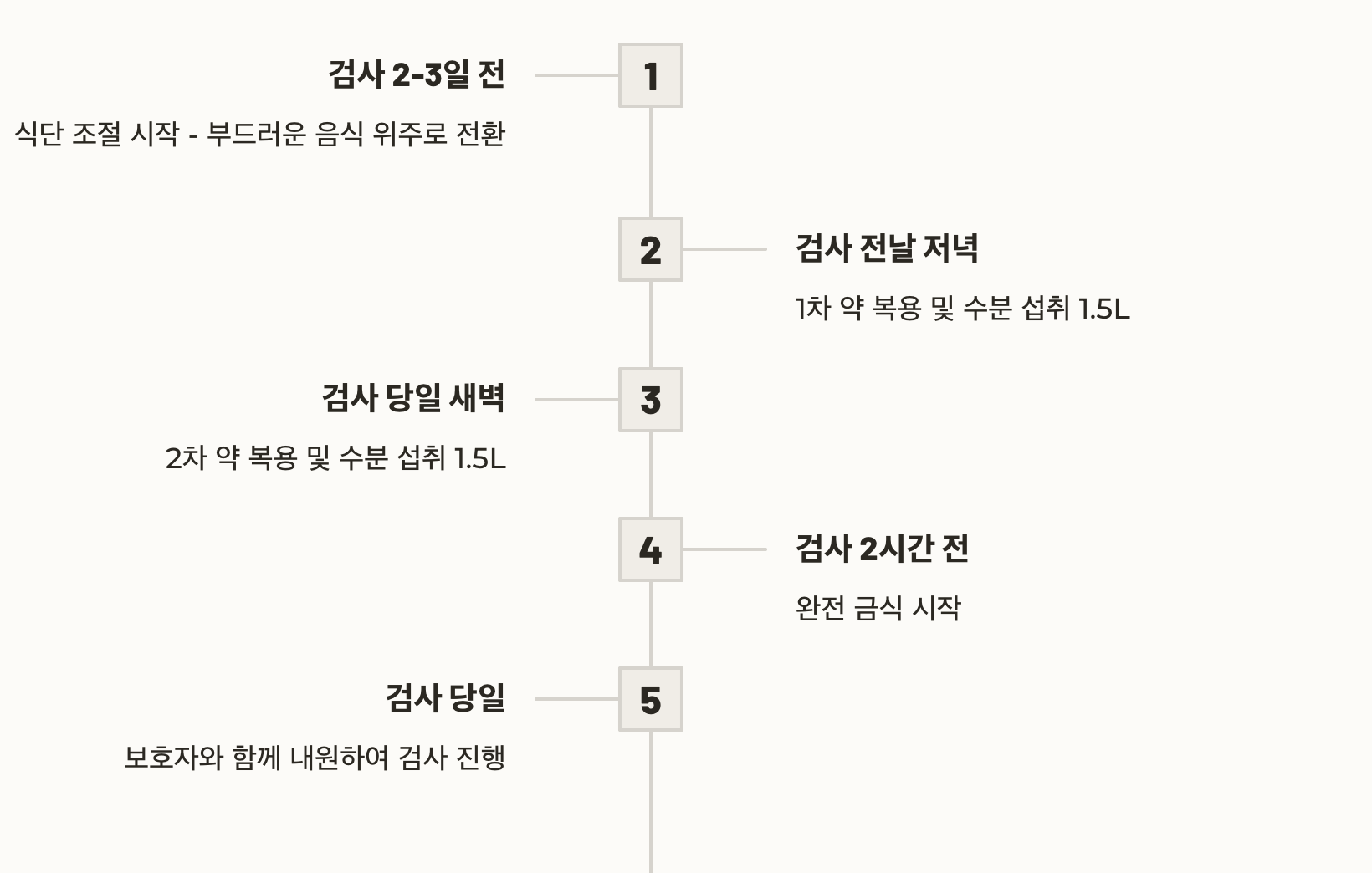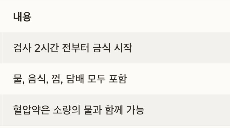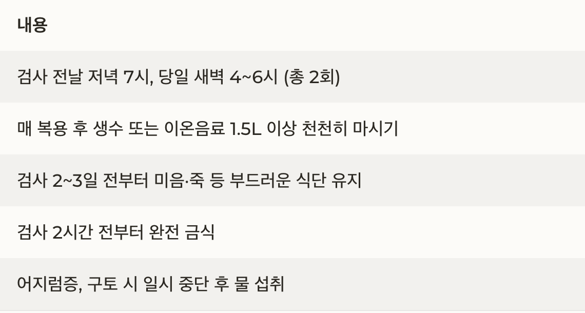 | 식단 조절 | 검사 2~3일 전부터 미음·죽 등 부드러운 식단 유지 |