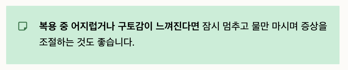 | 복용 시 유의점 | 어지럼증, 구토 시 일시 중단 후 물 섭취 |