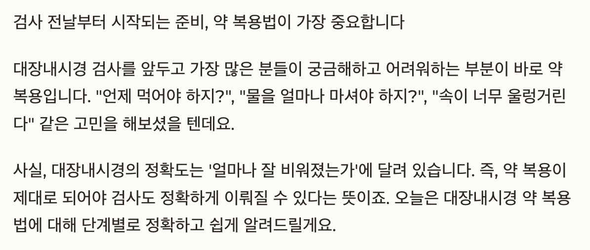 대장내시경 검사를 앞두고 가장 많은 분들이 궁금해하고 어려워하는 부분이 바로 약 복용입니다.