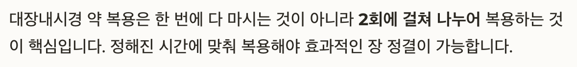 정해진 시간에 맞춰 복용해야 효과적인 장 정결이 가능합니다.