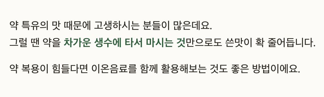 그럴 땐 약을 차가운 생수에 타서 마시는 것만으로도 쓴맛이 확 줄어듭니다.