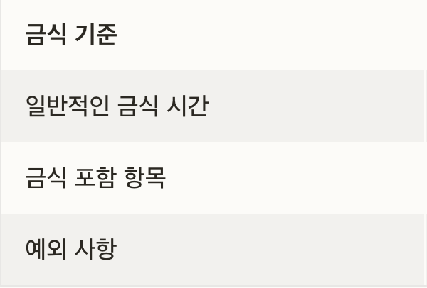 | 금식 포함 항목 | 물, 음식, 껌, 담배 모두 포함 |