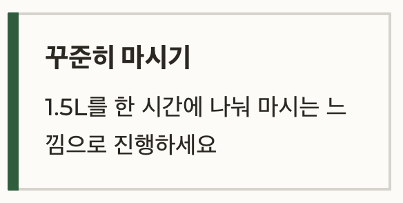 예를 들어 1.5L의 물을 한 시간에 나눠 마신다는 느낌으로 진행하세요.