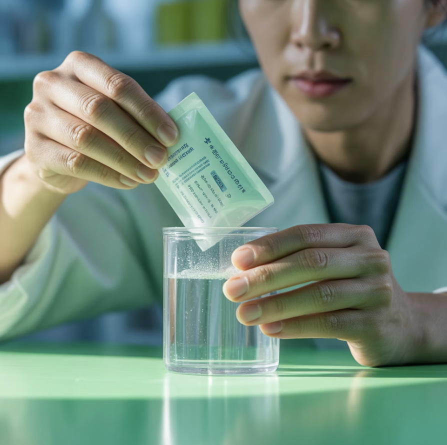 가루약의 경우, 용기 안에 들어 있는 A제와 B제를 물에 타서 마시게 되는데요.