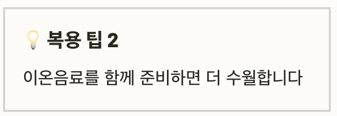 | 수분 섭취 | 매 복용 후 생수 또는 이온음료 1.5L 이상 천천히 마시기 |