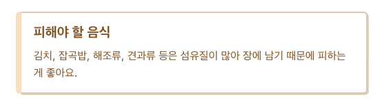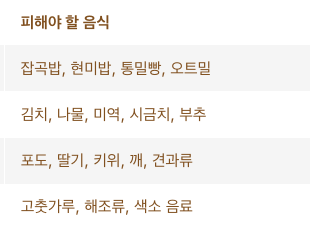 김치, 잡곡밥, 해조류, 견과류 등은 섬유질이 많아 장에 남기 때문에 피하는 게 좋아요. 물은 하루 1.5~2L 이상 충분히 마셔주는 게 중요합니다.