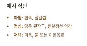 | 주식 | 흰쌀밥, 흰죽, 맑은 국물 |