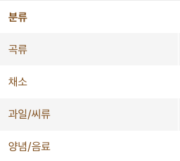 | 채소 | 김치, 나물, 미역, 시금치, 부추 |