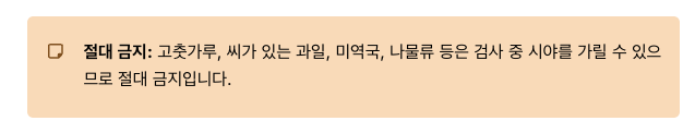 특히 고춧가루, 씨가 있는 과일, 미역국, 나물류 등은 검사 중 시야를 가릴 수 있으므로 절대 금지입니다.