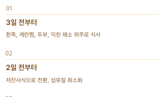 3일 전부터 흰죽, 계란찜, 두부, 익힌 채소 위주로 식사하고, 1일 전부터는 유동식으로 바꾸면 됩니다.