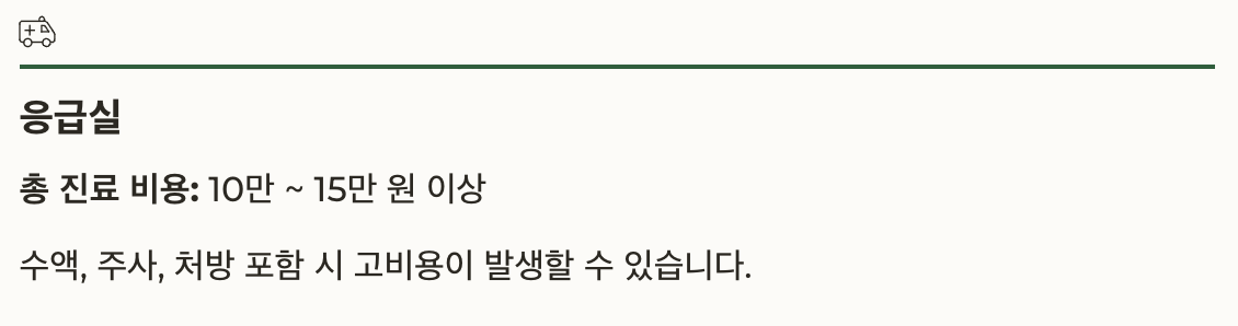 응급실 10만 ~ 15만 원 이상 수액, 주사, 처방 포함 고비용 가능