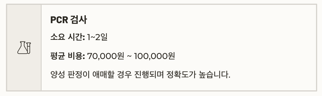 PCR 검사 1~2일 70,000원 ~ 100,000원 양성 판정 애매할 경우 진행됨