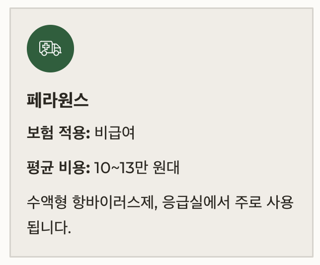 페라원스 비급여 병원별 10~13만 원대 수액형 항바이러스제, 응급실에서 사용됨