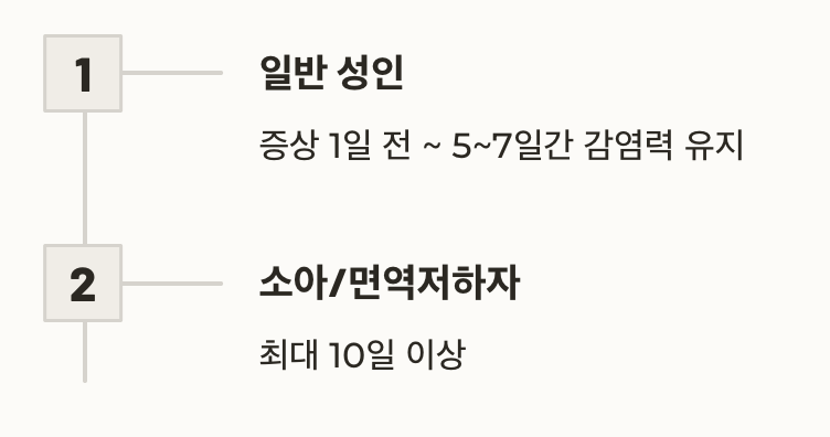 | 일반 성인 | 증상 1일 전 ~ 5~7일간 감염력 유지 |