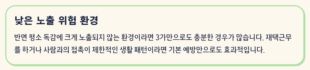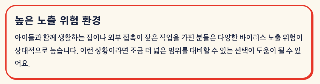 아이들과 함께 생활하는 집이나 외부 접촉이 잦은 직업을 가진 분들은 다양한 바이러스 노출 위험이 상대적으로 높습니다. 이런 상황이라면 조금 더 넓은 범위를 대비할 수 있는 선택이 도움이 될 수 있어요. 반면 평소 독감에 크게 노출되지 않는 환경이라면 3가만으로도 충분한 경우가 많습니다.