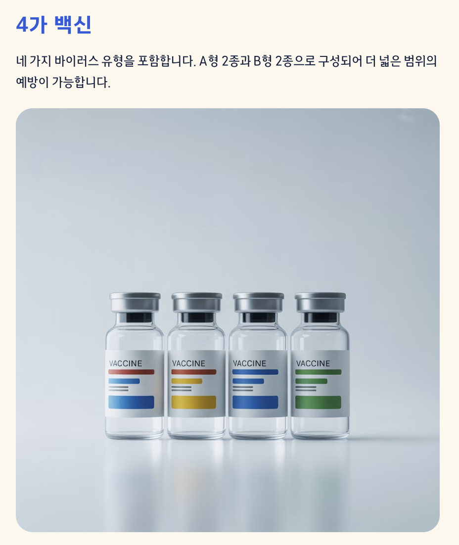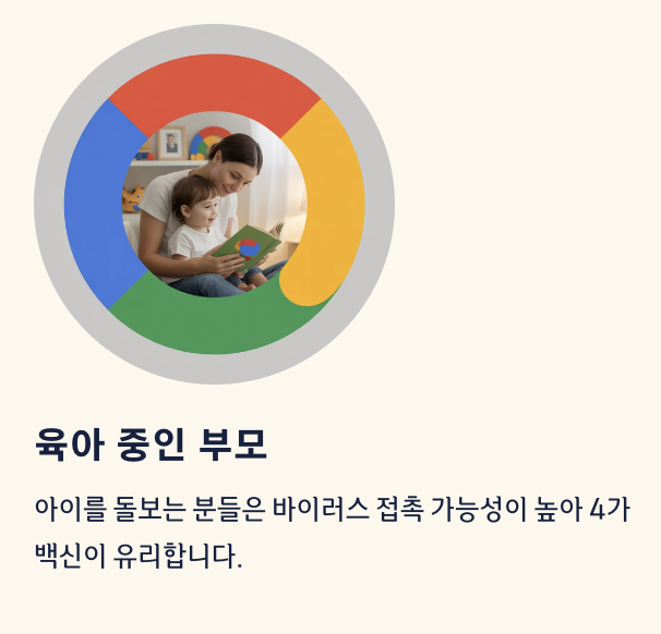 3가도 기본 예방에는 충분하지만, 더 폭넓은 보호가 필요하다면 4가가 도움이 됩니다. 특히 아이를 돌보는 분이나 사람을 많이 만나는 환경에서 생활하는 경우라면 바이러스 접촉 가능성이 높아져 선택 기준이 달라질 수 있어요.