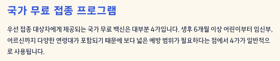 우선 접종 대상자에게 제공되는 국가 무료 백신은 대부분 4가입니다. 생후 6개월 이상 어린이부터 임신부, 어르신까지 다양한 연령대가 포함되기 때문에 보다 넓은 예방 범위가 필요하다는 점에서 4가가 일반적으로 사용됩니다.