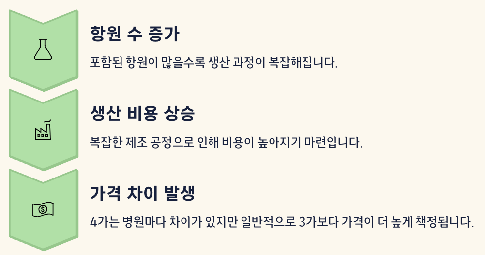 포함된 항원이 많을수록 생산 과정이 복잡하고 비용이 높아지기 마련입니다. 그래서 4가는 병원마다 차이가 있지만 일반적으로 3가보다 가격이 더 높게 책정됩니다. 같은 장소에서도 백신 종류에 따라 비용이 달라지는 이유도 여기에 있어요.
