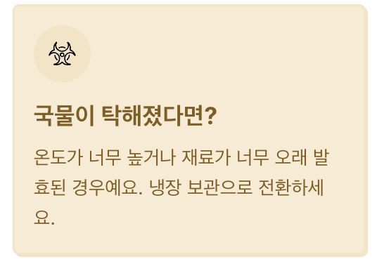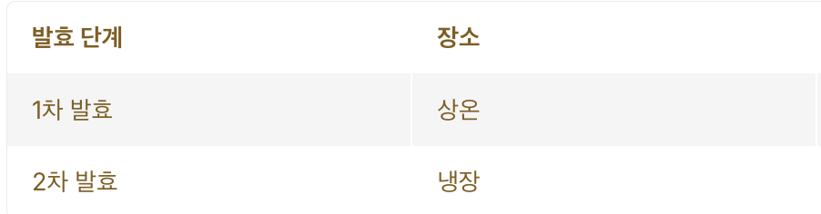 | 1차 발효 | 상온 | 1~2일 | 살짝 시큼한 냄새 시작 |