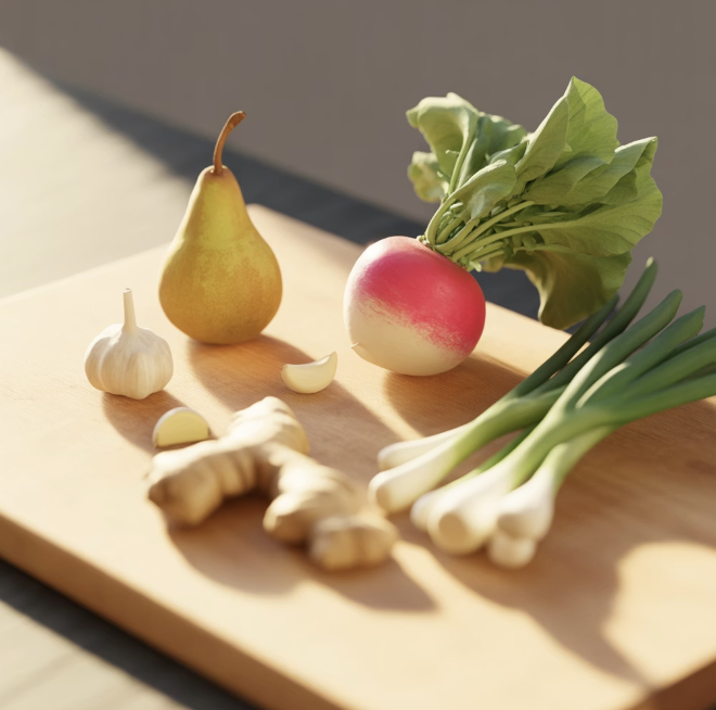 무는 단단하고 매끈한 것으로 준비하고, 배와 양파는 단맛을 살려주는 역할을 해요.