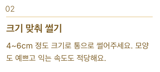 4~6cm 정도 크기로 통으로 담으면 모양도 예쁘고, 익는 속도도 적당해요.